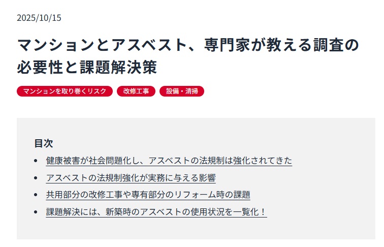 - マンションみらい価値研究所のコラムに弊社インタビュー記事が掲載されました。マンションみらい価値研究所(大和ライフネクスト株式会社)様コラムに専門家が教える調査の必要性と課題解決策として弊社インタビュー記事が掲載されました。 今回の …